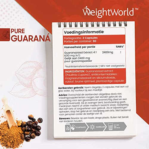 Puur Guarana extract – WeightWorld Guarana capsules zijn gemaakt van pure Guarana. Elke capsule bevat gedroogde guarana zaden die voorzichtig tot poeder zijn vermalen. Deze 100% natuurlijke guarana pillen zijn zorgvuldig en veilig vervaardigd volgens Europese normen.