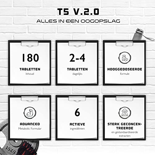 Specification: T5 V.2.0 BRN – Hoge dosis F-formule met 180 tabletten – Natuurlijke ingrediënten: Yerba Mate Blad Extract, African Mango Extract, Opuntia Nissus Extract, Cafeïne, Raspberry – Vegan – Duitse Elite Nutrition