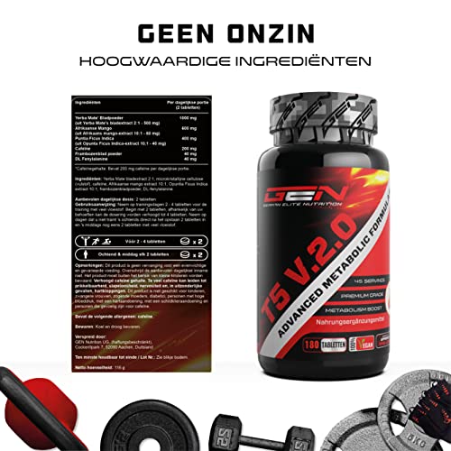 T5 V.2.0 BRN – Hoge dosis F-formule met 180 tabletten – Natuurlijke ingrediënten: Yerba Mate Blad Extract, African Mango Extract, Opuntia Nissus Extract, Cafeïne, Raspberry – Vegan – Duitse Elite Nutrition