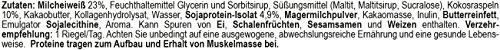 invertsuikerstroop, kokosnoot vlokken(13,9%), glucose-siroop, polydextrosestroop( polydextrose(6,5%), water)(9,3%), MELK PROTEïNE(8,8%), MELK PROTEïNE ISOLAAT(8,4%), cacaomassa, suiker, plantaardig vet( palmolie), kokosmelkpoeder(4,1%), cacaoboter, aroma’s, gejodeerd zout, emulgator( SOJALECITHINE), antioxidanten( ascorbinezuur)