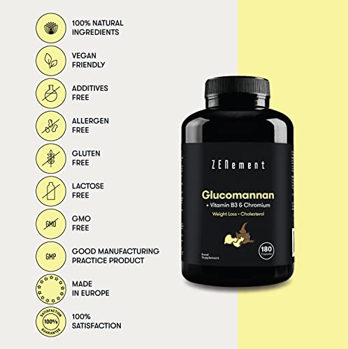 Specification: Glucomannan 4200 mg per Dagdosering met Vitamine B3 en Chroom – Konjacwortelvezel – Voor Gewichtsbeheersing – 180 Vegan Capsules – Zenement
