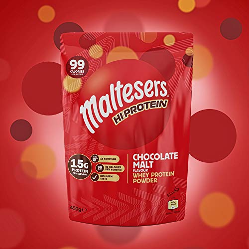 Specification: Maltesers Hi Protein Chocolate Malt Flavour Whey Protein Shake Powder 450g Pouch, 18 porties, 15g eiwit en slechts 99 calorieën, geschikt voor vegetariërs