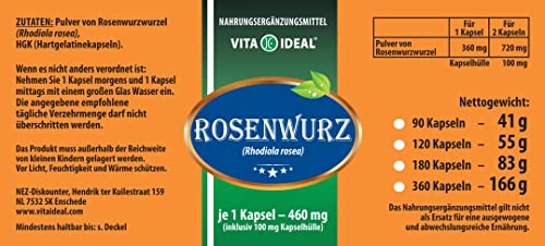 Specification: VITAIDEAL ® Rozen Wortel (gouden wortel, rhodiola rosea) 180 capsules 460mg per stuk, uit zuiver natuurlijke kruiden, zonder toevoegingen van NEZ-Diskounter