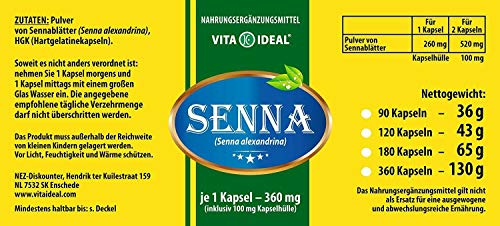 Specification: VITAIDEAL ® Senna Blades (Senna alexandrina) 3×360 capsules 360mg per stuk, uit zuiver natuurlijke kruiden, zonder toevoegingen van NEZ-Diskounter