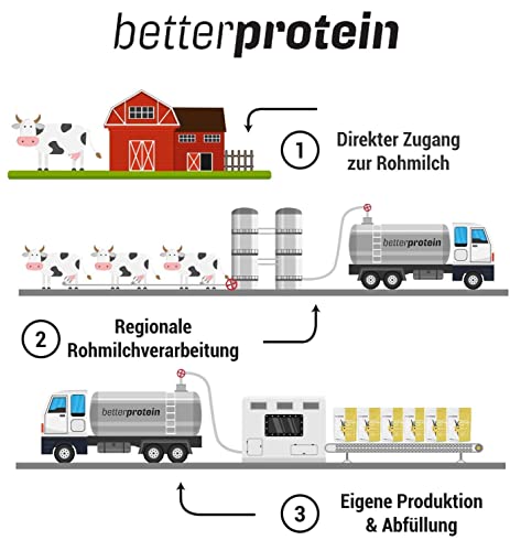 REGIONAAL PRODUCT UIT DUITSLAND: Wij gebruiken voor onze weiproteïnemelk van kleine en middelgrote boeren uit Noord-Duitsland en verwerken deze vervolgens zelf. Zo kunnen wij afzien van onnodige transporten of zelfs geïmporteerde melk. Made in Germany betekent voor ons meer dan alleen het vullen van geïmporteerde grondstoffen.