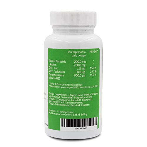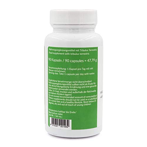 Specification: Tribulus Terrestris – 90 capsules – elk met 200mg Tribulus Terrestris en 200mg L-Arginine, Zink, Selenium en Pantotheenzuur (Vitamine B5) – uit Duitsland – minder vermoeidheid – energiemetabolisme
